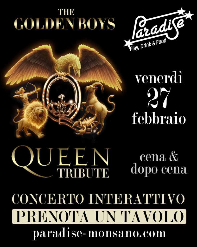 Una serata che va oltre il semplice concerto! I The Golden Boys vi porteranno nell’universo inimitabile dei Queen, con le hit che hanno segnato la storia del rock: da Bohemian Rhapsody a We Will Rock You, passando per Radio Ga Ga e We Are the Champions — tutte eseguite con passione e precisione per far rivivere l’energia e il carisma della band britannica.